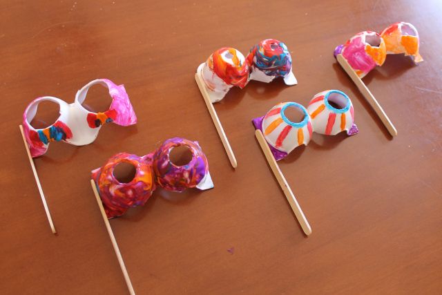 A może by urządzić przebieraną imprezę? Karton po jajkach to świetny materiał na stworzenie papierowych okularków. Będziesz potrzebować jeszcze patyczków po lodach lub kredek ołówkowych. Wystarczy, że wytłoczkę wytniesz w odpowiedni sposób, pokolorujesz według uznania i przyczepisz do patyczka. A potem przyłóż do oczu i sprawdź, czy ktoś Cię pozna.