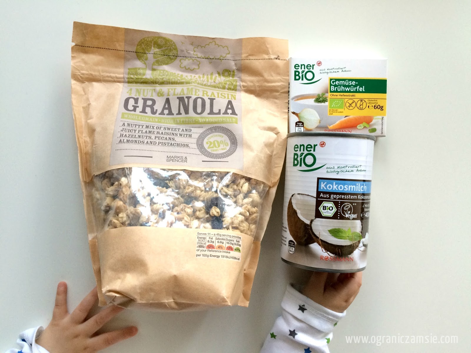 - Granola orzechowa z Marks & Spencers – moje mieszczuchostwo wychodzi również tutaj. Wiem, że nie wszędzie znajdziecie ten sklep, ale jeśli wiecie, gdzie się znajduje, warto czasem zajrzeć do ich sekcji spożywczej. Udało mi się tam upolować granolę, która nie zawiera oleju palmowego (!!!) i syropu glukozowo-fruktozowego! Uwierzcie mi, że to wielki wyczyn. Co prawda w składzie jest cukier, ale ufam mu bardziej niż wspomnianemu syropowi, który nomen omen produkowany jest najczęściej z kukurydzy modyfikowanej genetycznie i przyczynia się do szybszego tycia. Orzeszki pekan, laskowe i pestki dyni są lekko uprażone, co przyjemnie podkreśla smak. Są na razie moim numerem jeden jeśli chodzi o szybkie śniadania.